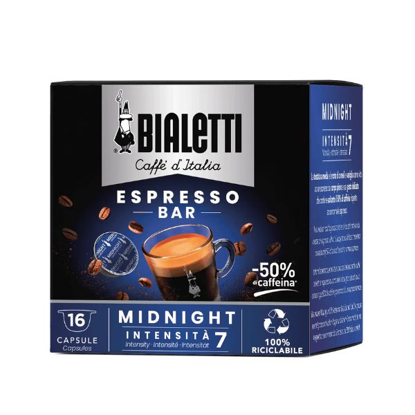 Le capsule Bialetti Midnight racchiudono un caffè di pregiate origini Arabica arricchita con Robusta indonesiana. Grazie ad un accurato processo di selezione delle origini, questo caffè contiene il 50% in meno di caffeina rispetto alla miscela Bialetti Napoli.