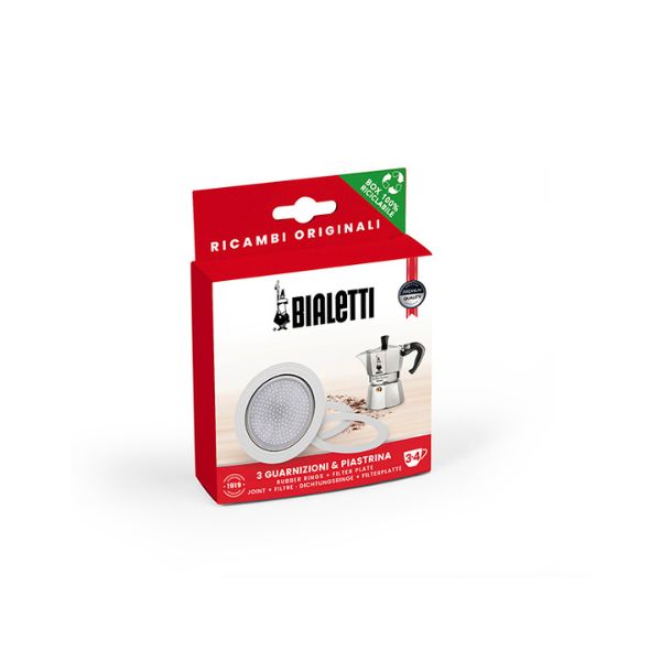 La confezione contiene tre guarnizioni e una piastrina filtro. Tali ricambi (originali BIALETTI) sono idonei per i seguenti modelli di Moka da DUE TAZZE: Moka Express, Dama, Break, Mini Express